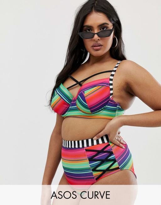 Støttende top med skåle og trusse multistribet bikinisæt fra ASOS DESIGN Curve