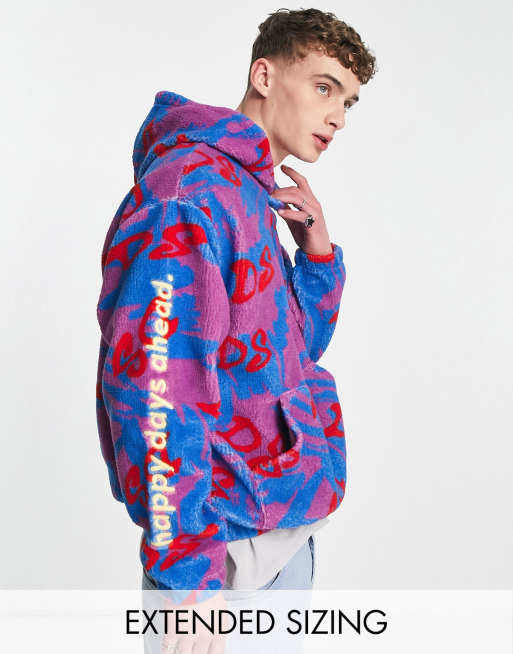 ASOS Daysocial - Oversized blå hættetrøje i imiteret lammeskind med gennemgående print og logobroderi