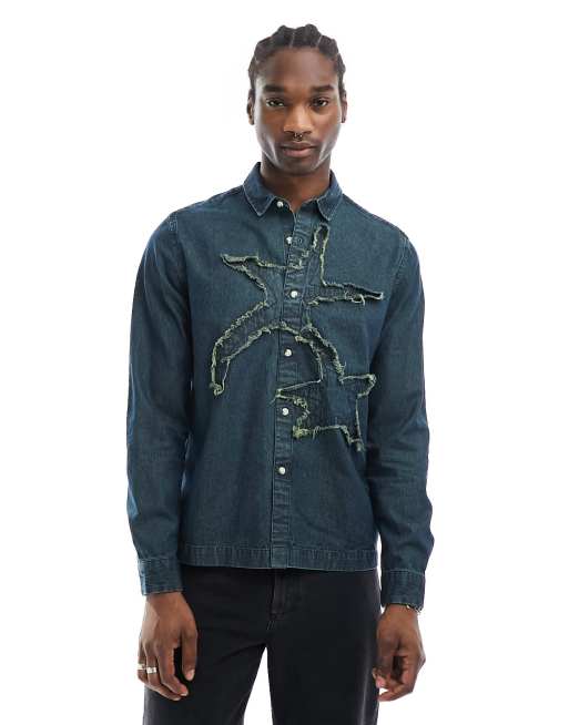 ASOS DESIGN - Afslappet denimskjorte med slidt stjernedetalje i afbleget, blå vask