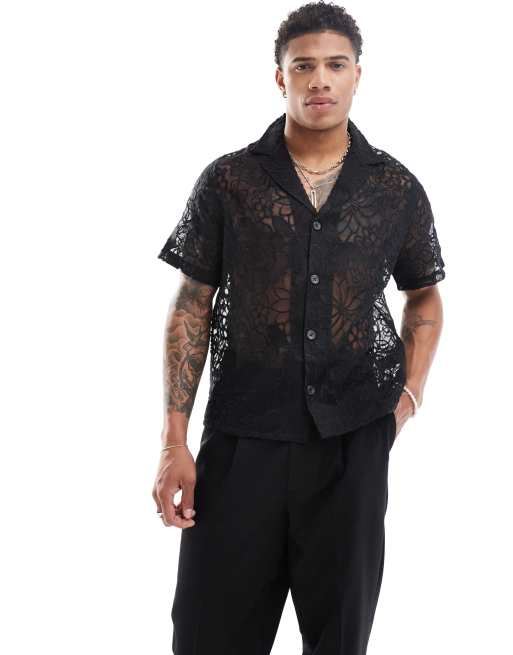 ASOS DESIGN - Afslappet skjorte med dyb reverskrave og gennemgående broderier i sort i firkantet pasform