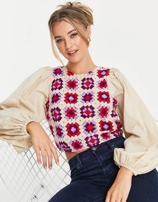 ASOS DESIGN - Beige langærmet top med patchwork-hæklet detalje og kvastbinding