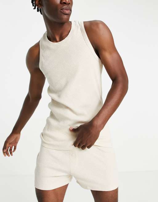 ASOS DESIGN - Beige lounge-pyjamassæt med stribet top og boksershorts