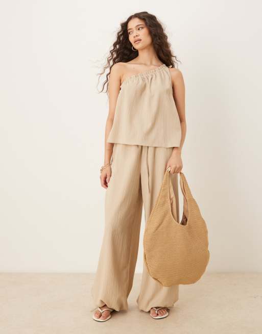 ASOS DESIGN - Beige sæt med oneshoulder-top og pull-on-bukser i palazzo-stil