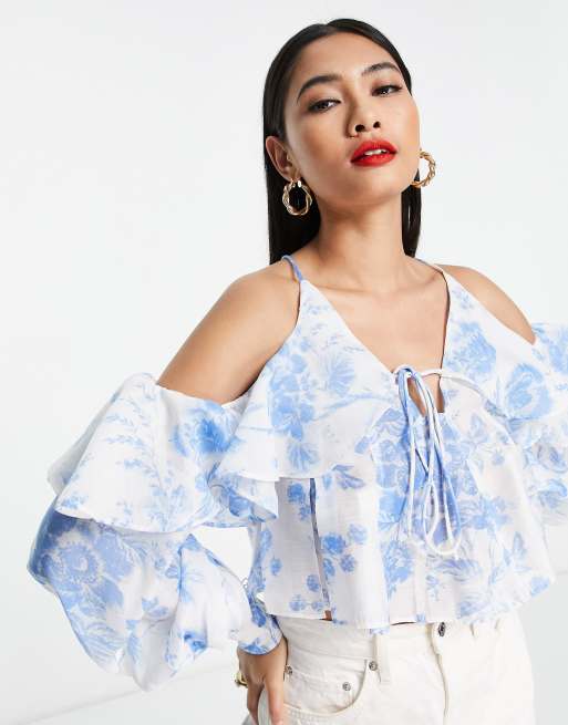 ASOS DESIGN - Blå flæsebluse med snøre i ryggen og blomstermønster