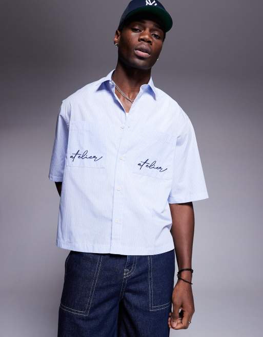 ASOS DESIGN - Blå og hvid oversized skjorte med lommebroderi og mikrotern i firkantet pasform