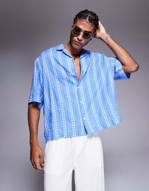 ASOS DESIGN - Blå oversized skjorte med reverskrave og jacquard-blomstermønster i firkantet pasform