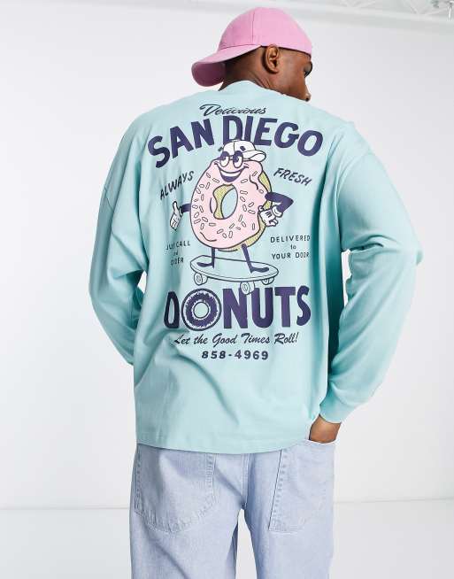 ASOS DESIGN - Blå oversized T-shirt med lange ærmer og tegneserie donutprint på ryggen