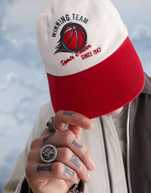 ASOS DESIGN - Blød baseballcap med basketball-broderi i rød og beige