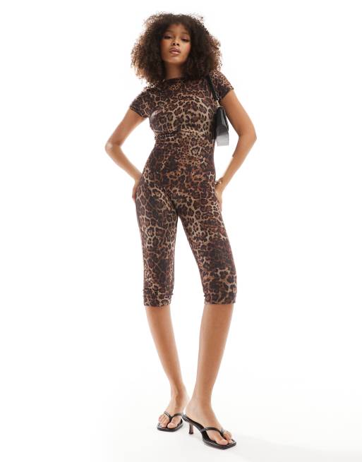 ASOS DESIGN - Blød, tætsiddende heldragt med åben ryg og 3/4-lange bukser i leopardprint