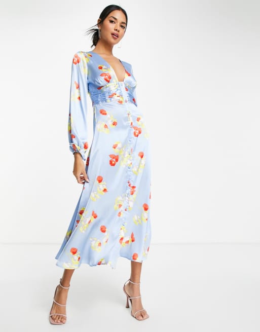 ASOS DESIGN - Blomstret tea-midikjole i satin med knapper og trompetærmer