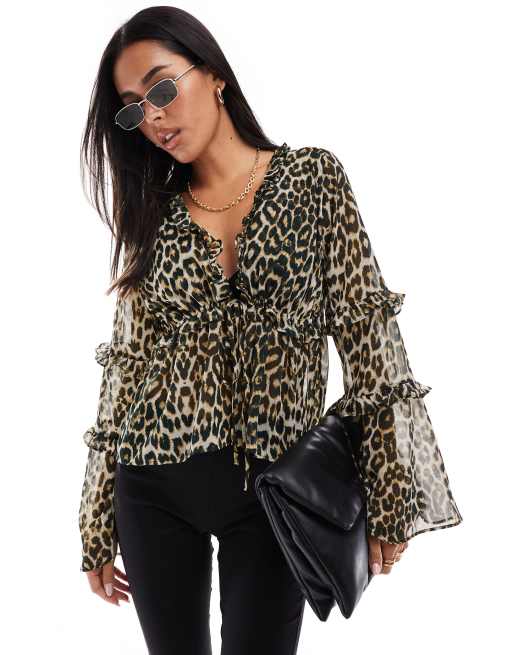 ASOS DESIGN - Bluse med flæser og leopardprint i chiffon