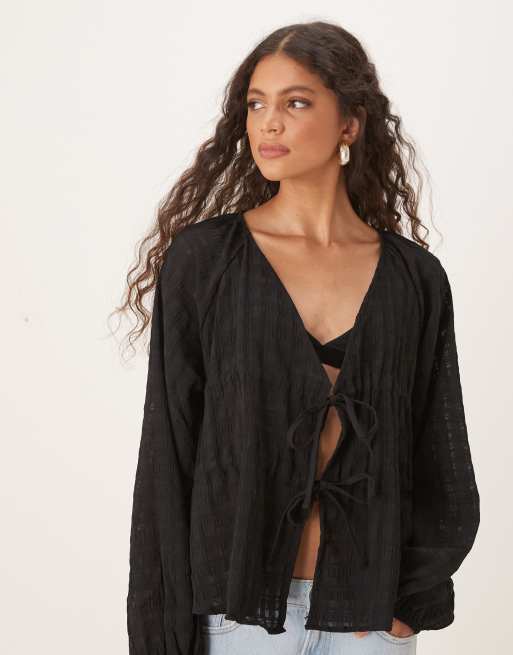 ASOS DESIGN - Bluse med tekstur, dyb udskæring og bindedetalje
