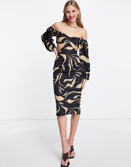 ASOS DESIGN - Bodycon-midikjole med Bardot-snit, udskæring og print