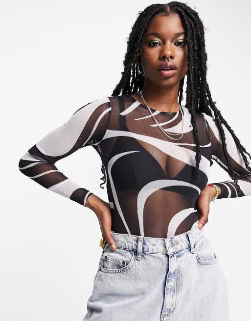 ASOS DESIGN - Bodystocking i mesh med sort og hvid hvirvelprint - MULTI