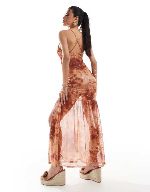 ASOS DESIGN - Boho-maxikjole med stropper og indsyet kant samt sideslids i mesh med marmorprint