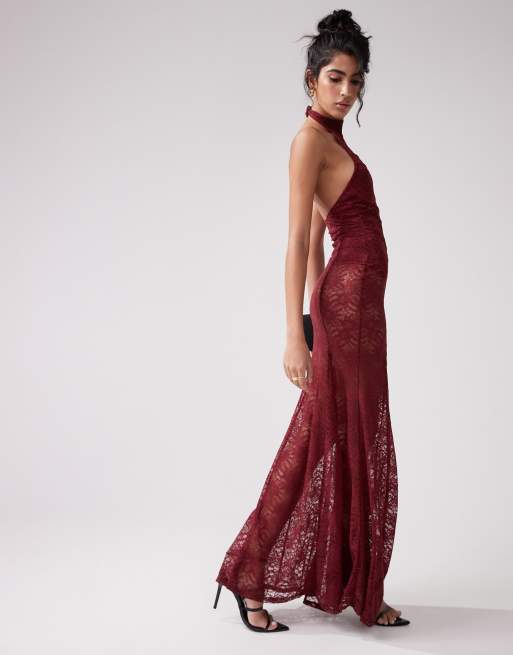 ASOS DESIGN - Bordeaux gennemsigtig maxikjole i tyndt blondestof med halterneck og paneler