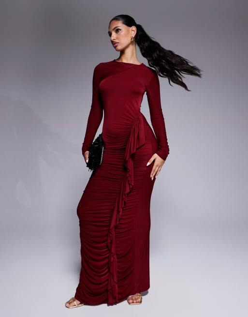 ASOS DESIGN - Bordeaux langærmet maxikjole med rynket flæsedetalje