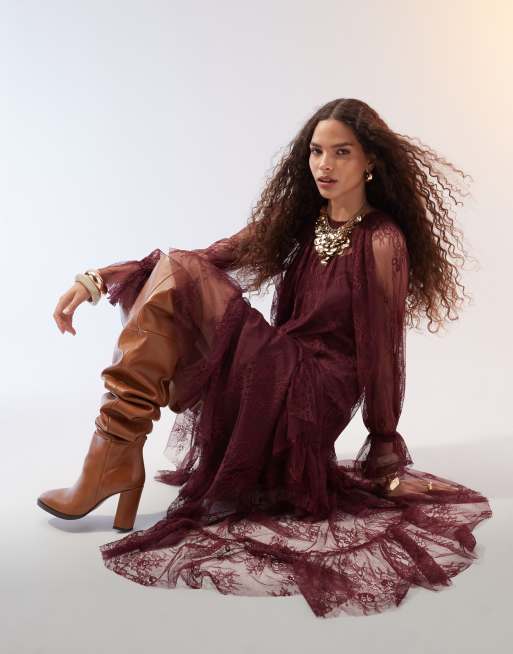 ASOS DESIGN - Bordeaux maxikjole med flæsedetalje og blonder