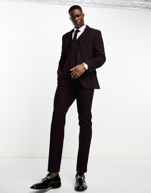 ASOS DESIGN - Bordeaux slim-jakkesæt med sildebensmønster i uldblanding