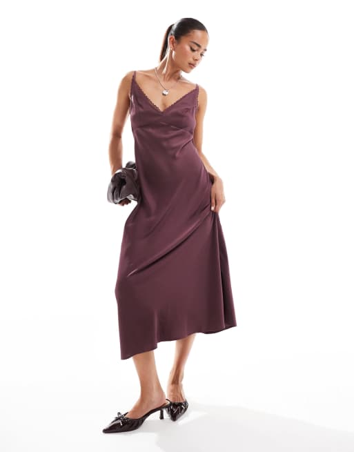 ASOS DESIGN - Bordeaux slip-kjole med cami-stropper og blondekant