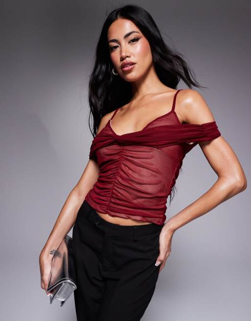 ASOS DESIGN - Bordeauxrød bardot-overdel i dobbeltlags og rynket mesh