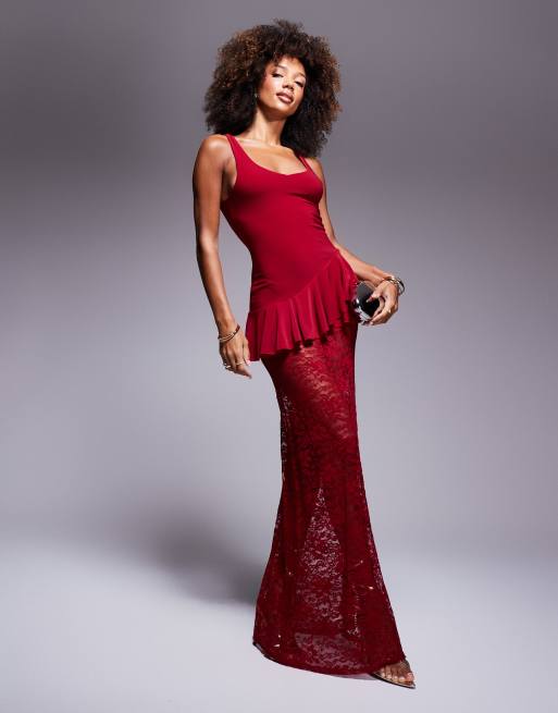 ASOS DESIGN - Bordeauxrød maxikjole med dyb og rund hals og cami-stropper samt dobbelte flæser og gennemsigtig blondenederdel