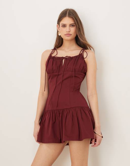 ASOS DESIGN - Bordeauxrød minikjole i bomuldssatin med sænket talje og bindebånd over brystet