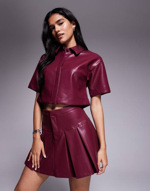 ASOS DESIGN - Bordeauxrød mininederdel i læderlook med plisseringer - Del af sæt