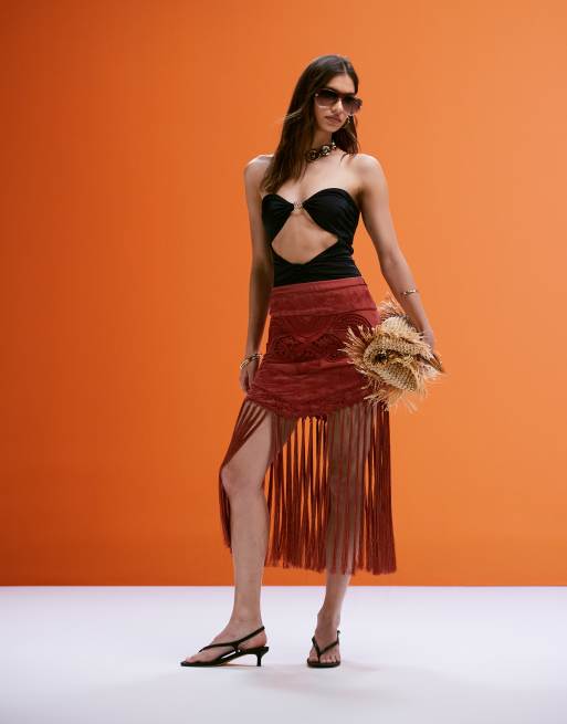 ASOS DESIGN - Bordeauxrød nederdel med broderinger og frynsedetaljer