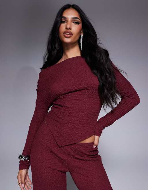 ASOS DESIGN - Bordeauxrød og tekstureret offshoulder-top med asymmetrisk kant forneden - Del af sæt