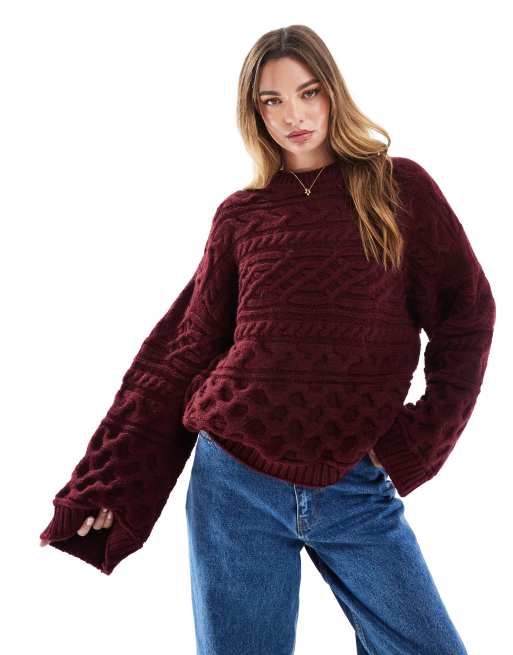 ASOS DESIGN - Bordeauxrød trøje i 3D kabelstrik med brede ærmer
