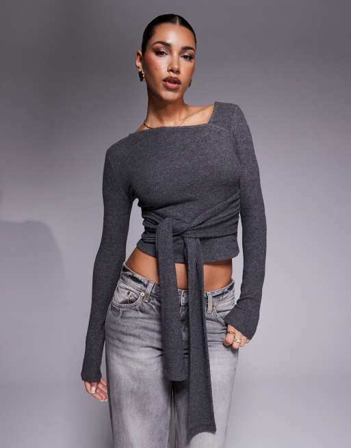ASOS DESIGN - Børstet og langærmet koksgrå top med asymmetrisk hals og bindetalje