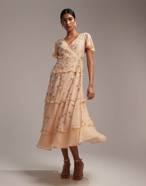 ASOS DESIGN - Brudepiger - Abrikosfarvet slå-om-midikjole med flagrende ærmer, udsmykninger og broderier