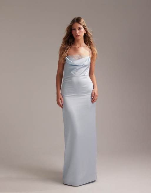 ASOS DESIGN - Brudepiger - Lyseblå maxikjole i satin med blondedetaljer og søjlesnit