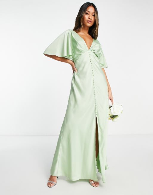 ASOS DESIGN - Brudepiger - Salviegrøn maxikjole med knapper og kappeærmer i satin