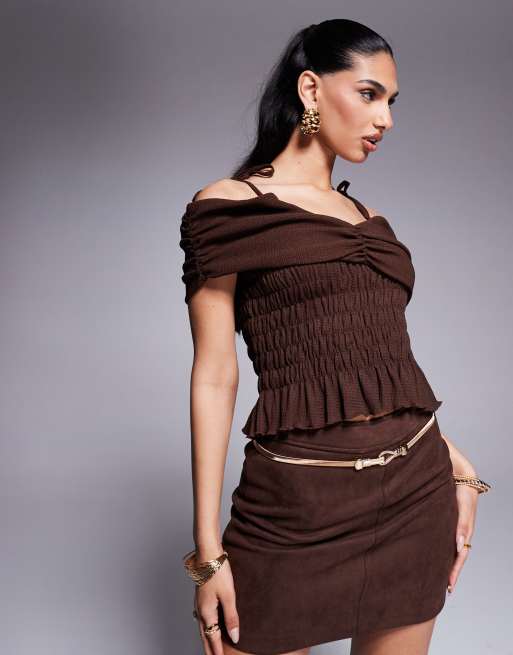 ASOS DESIGN - Brun bardot-croptop med rynker og bindebånd på skuldrene