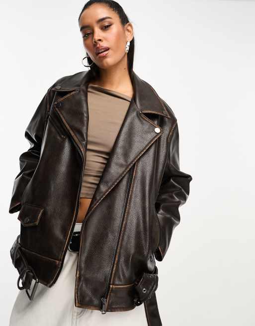 ASOS DESIGN - Brun bikerjakke i forvasket imiteret læder