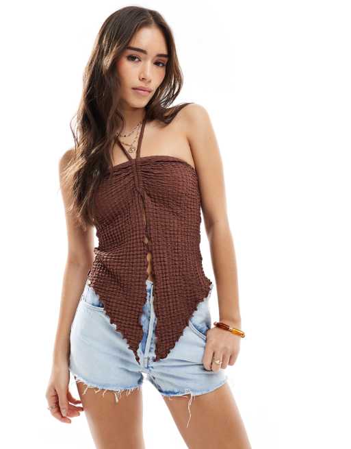 ASOS DESIGN - Brun festivaltop med halterneck, slids foran og tekstur