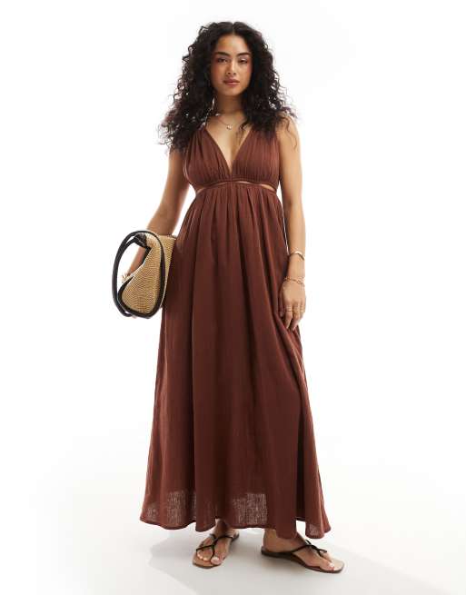 ASOS DESIGN - Brun maxikjole med snoede stropper og udskåret detalje i dobbelt lærredsstof