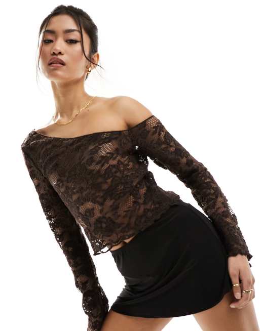 ASOS DESIGN - Brun og langærmet top med blonder og asymmetrisk snit