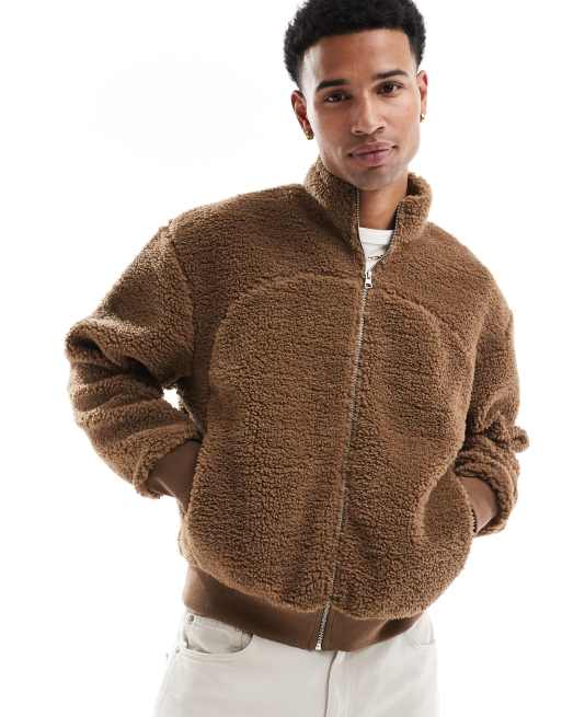 ASOS DESIGN - Brun og oversized træningsjakke i imiteret lammeskind med firkantet pasform og syningsdetalje