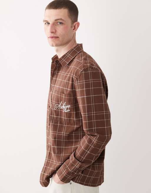 ASOS DESIGN - Brun skjorte med broderi på brystet og tern i regular fit