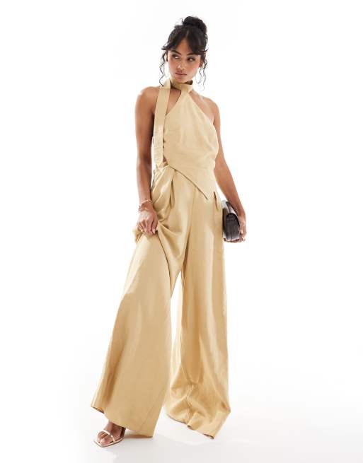 ASOS DESIGN - Brunt jumpsuit med halterneck, bindedetalje og vide ben