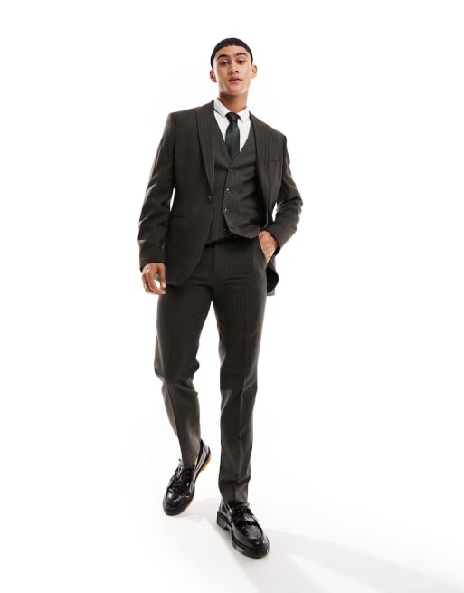ASOS DESIGN - Brunt slim-jakkesæt med nålestriber
