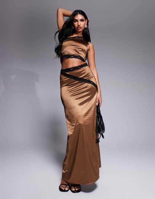 ASOS DESIGN - Brunt sæt med croptop med oneshoulder-snit og kontrasterende blondekant og maxinederdel