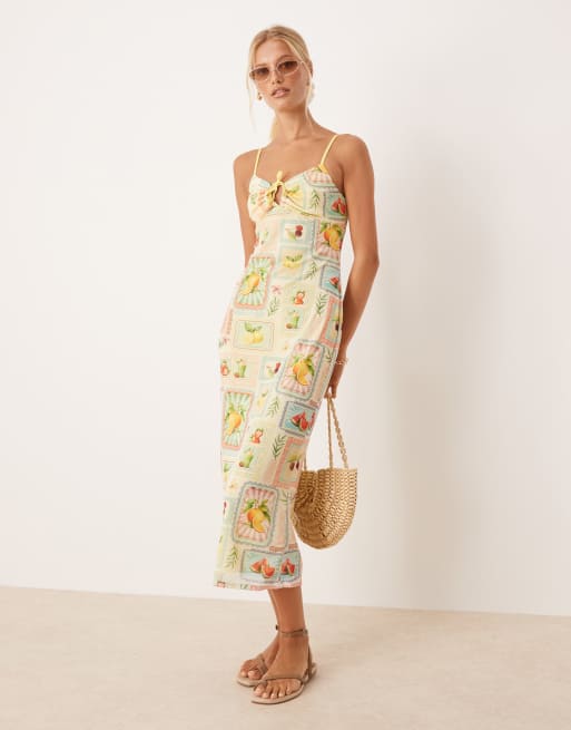 ASOS DESIGN - Cami-midikjole med løbesnor og frugtprint i mesh