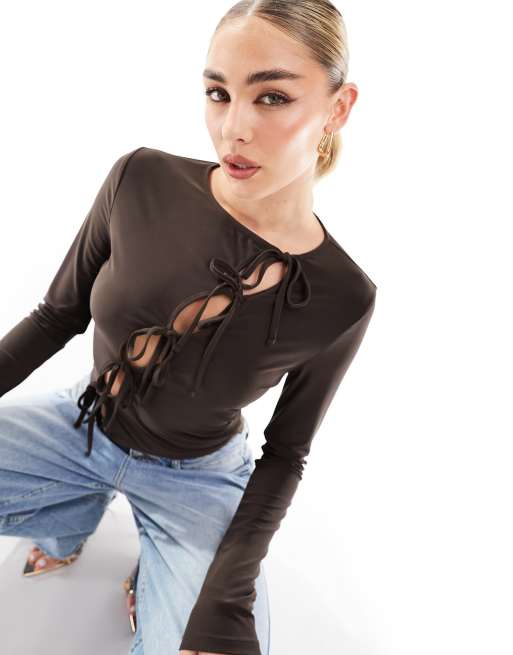 ASOS DESIGN - Chokoladebrun langærmet top med bindebånd foran
