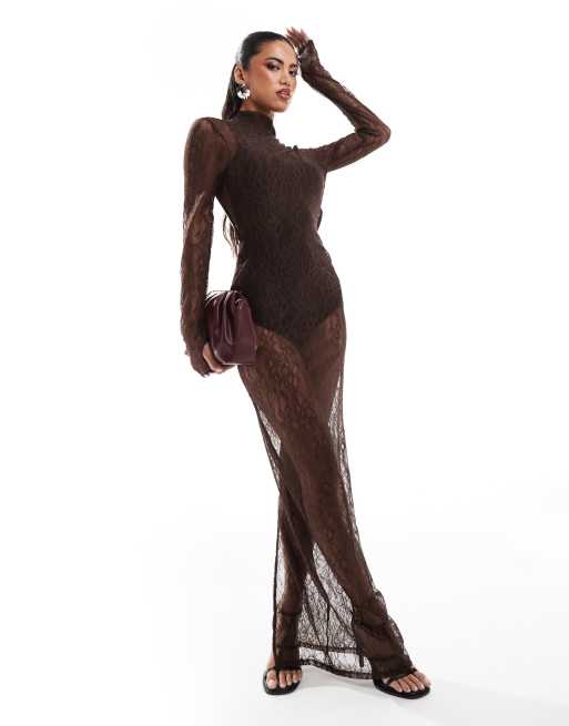 ASOS DESIGN - Chokoladebrun maxikjole med blondeoverlag