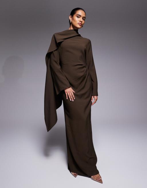 ASOS DESIGN - Chokoladebrun maxikjole med lange ærmer og tørklædedetalje