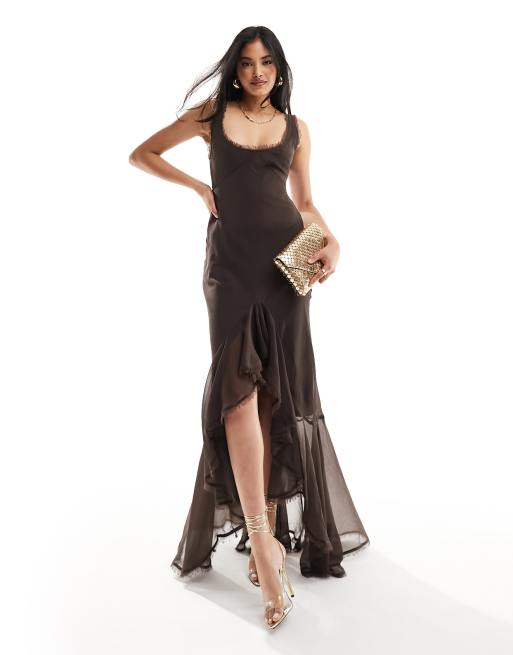 ASOS DESIGN - Chokoladebrun maxikjole med rund hals og rå kant med høj lav kant og spændetalje bagpå